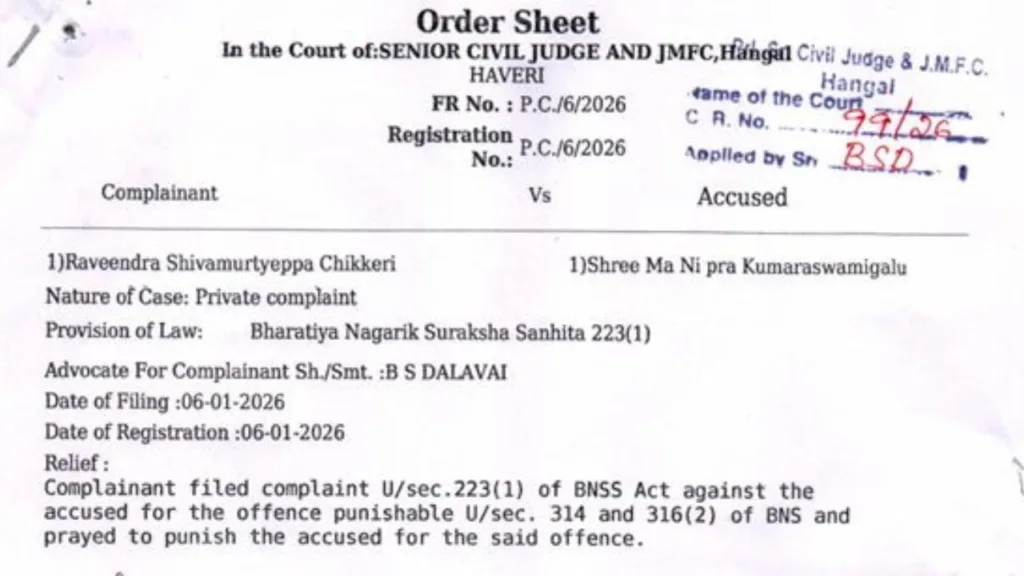 ಕುಮಾರೇಶ್ವರ ಮಠದ ಆಸ್ತಿಯನ್ನು ಕಾನೂನುಬಾಹಿರವಾಗಿ ಮಾರಾಟ ಮಾಡಿದ್ದಾರೆಂದು ಆರೋಪಿಸಿ ಹುಬ್ಬಳ್ಳಿ ಮೂರುಸಾವಿರ ಮಠದ ಪೀಠಾಧಿಪತಿ ಗುರುಸಿದ್ದ ರಾಜಯೋಗೀಂದ್ರ ಸ್ವಾಮೀಜಿ, 66, ಅವರ ವಿರುದ್ಧ ಹಾನಗಲ್ ನಗರದ ಪೊಲೀಸ್ ಠಾಣೆಯಲ್ಲಿ ಫೆಬ್ರವರಿ 2 ದೂರು ದಾಖಲಾಗಿದೆ.