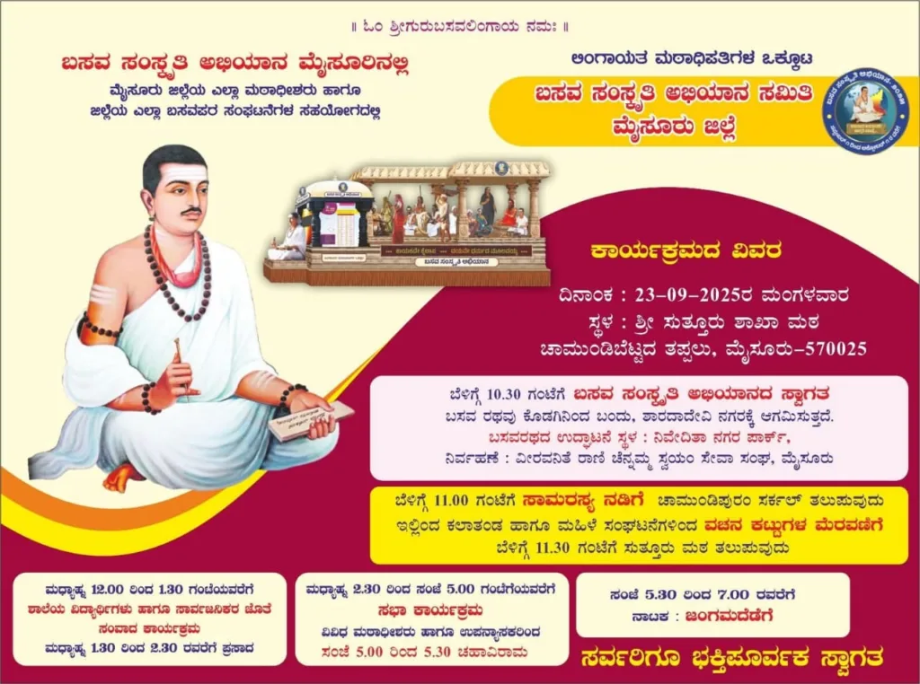 ಮಧ್ಯಾಹ್ನ 12 ಗಂಟೆಗೆ ಕಾಲೇಜು ವಿದ್ಯಾರ್ಥಿಗಳು ಹಾಗೂ ಸಾರ್ವಜನಿಕರೊಂದಿಗೆ ‘ವಚನ ಸಂವಾದ’ ಸುತ್ತೂರು ಶಾಖಾ ಮಠ, ಚಾಮುಂಡಿ ಬೆಟ್ಟದ ತಪ್ಪಲು.