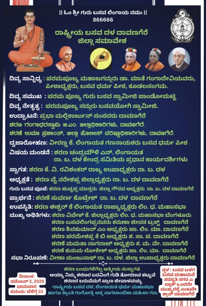 ಸಾನಿಧ್ಯವನ್ನು ಕೂಡಲಸಂಗಮ ಬಸವಧರ್ಮ ಪೀಠದ ಪೀಠಾಧ್ಯಕ್ಷರಾದ ಡಾ. ಗಂಗಾ ಮಾತಾಜಿ ವಹಿಸಲಿದ್ದಾರೆ. ಸಮ್ಮುಖವನ್ನು ಪಾಂಡೋಮಟ್ಟಿಯ ಡಾ. ಗುರುಬಸವ ಸ್ವಾಮೀಜಿ, ನೇತೃತ್ವವನ್ನು ಪೂಜ್ಯ ಬಸವಯೋಗಿ ಸ್ವಾಮೀಜಿ ವಹಿಸಲಿದ್ದು, ದಾವಣಗೆರೆಯ ಸಂಸದೆ ಪ್ರಭಾ ಮಲ್ಲಿಕಾರ್ಜುನ ಸಮಾವೇಶ ಉದ್ಘಾಟಿಸಲಿದ್ದಾರೆ. ಅಧ್ಯಕ್ಷತೆಯನ್ನು ಜಿಲ್ಲಾಧ್ಯಕ್ಷ ವೈ. ನರೇಶಪ್ಪ ಅವರು ವಹಿಸುವರು.