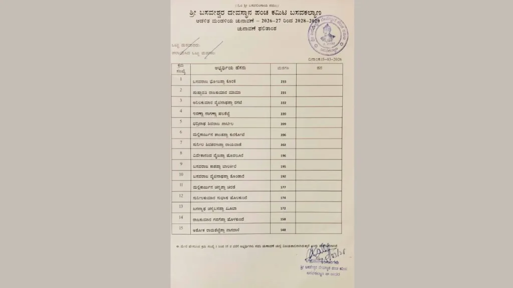 ದೇವಸ್ಥಾನ ಸಮಿತಿಯಲ್ಲಿ ಒಟ್ಟು 434 ಸದಸ್ಯರಿದ್ದು, ಇವರಲ್ಲಿ 15 ಜನರನ್ನು ನಿರ್ದೇಶಕರಾಗಿ ಆಯ್ಕೆ ಮಾಡಲಾಗಿದೆ. ಇದರಲ್ಲಿ ಒಬ್ಬ ಮಹಿಳೆಯ ಆಯ್ಕೆ ಕಡ್ಡಾಯವಾಗಿತ್ತು. ಚುನಾವಣೆಯಲ್ಲಿ ಎರಡು ತಂಡಗಳಿಂದ ತಲಾ 15 ಅಭ್ಯರ್ಥಿಗಳು ಹಾಗೂ ಪಕ್ಷೇತರರಾಗಿ 10 ಮಂದಿ ಸೇರಿದಂತೆ ಒಟ್ಟು 40 ಮಂದಿ ಕಣದಲ್ಲಿದ್ದರು. 15ರಂದು ಚುನಾವಣೆ ನಡೆದಿತ್ತು.