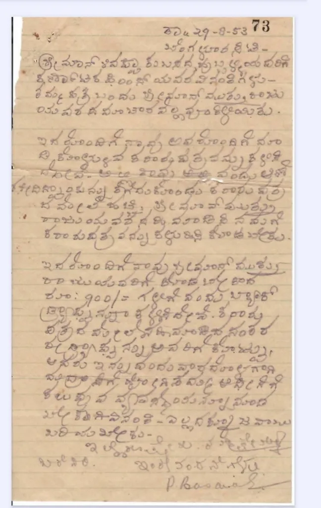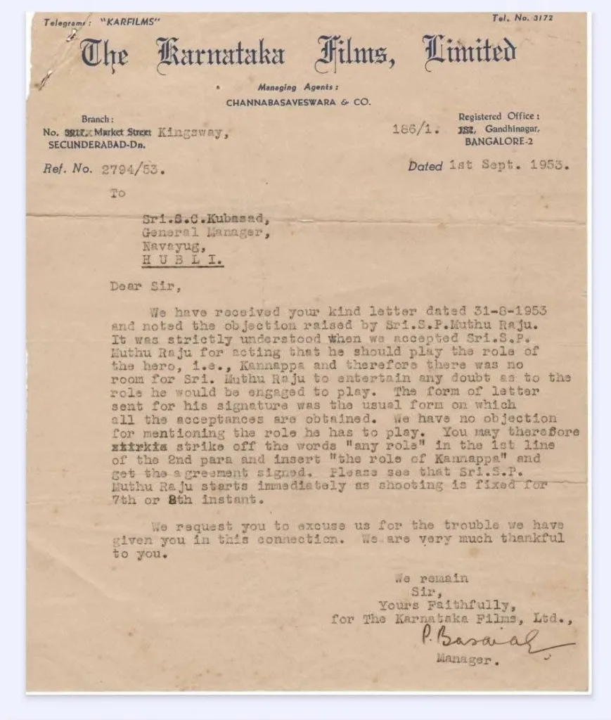 ಆಗ ಪತ್ರವನ್ನು ಓದಿದ ಗದುಗಿನ ಕುಬಸದ ಶಿವಪ್ಪನವರು ‘ಯಾವುದೇ ಪಾತ್ರ ನಿರ್ವಹಿಸಬೇಕು’ ಎನ್ನುವ ವಾಕ್ಯಕ್ಕೆ ತೀವ್ರ ಆಕ್ಷೇಪ ವ್ಯಕ್ತಪಡಿಸಿ ಕರ್ನಾಟಕ ದಿ ಕರ್ನಾಟಕ ಫಿಲಂಸ್ ನಲ್ಲಿ ಕಾರ್ಯನಿರ್ವಹಿಸುತ್ತಿದ್ದ ಪಿ. ಬಸಯ್ಯನವರಿಗೆ ಆಗಸ್ಟ್ 31, 1953 ರಂದು ಪತ್ರ ಬರೆದರು.