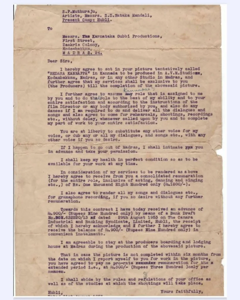 ಕರಾರಿನ ಪ್ರಕಾರವಾಗಿ ಬೇಡರ ಕಣ್ಣಪ್ಪ ಚಿತ್ರದ ಮುಖ್ಯ ಪಾತ್ರದಲ್ಲಿ ಅಭಿನಯಿಸಲು ಮುತ್ತುರಾಜ್ ಅವರಿಗೆ ಅಡ್ವಾನ್ಸ್ ರೂಪದಲ್ಲಿ 900 ರೂಪಾಯಿಗಳನ್ನು ಹುಬ್ಬಳ್ಳಿಯಲ್ಲಿನ ಕೆನರಾ ಇಂಡಸ್ಟ್ರಿಯಲ್ ಆಂಡ್ ಬ್ಯಾಂಕಿಂಗ್ ಸಿಂಡಿಕೇಟ್ ಬ್ಯಾಂಕ್ ಡ್ರಾಫ್ಟ್ ಮೂಲಕ ಹಣವನ್ನು ಕಳಿಸಲಾಯಿತು.