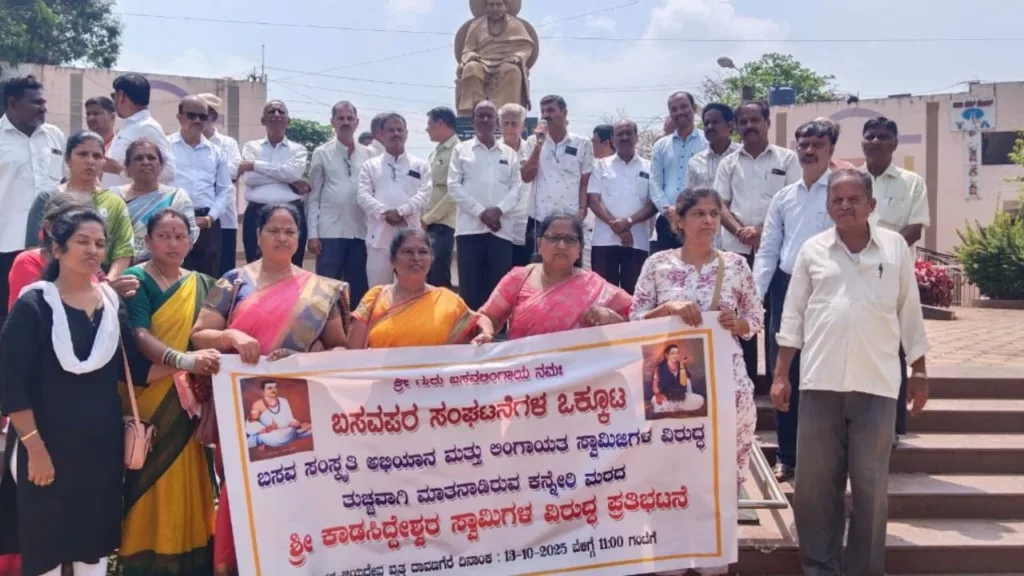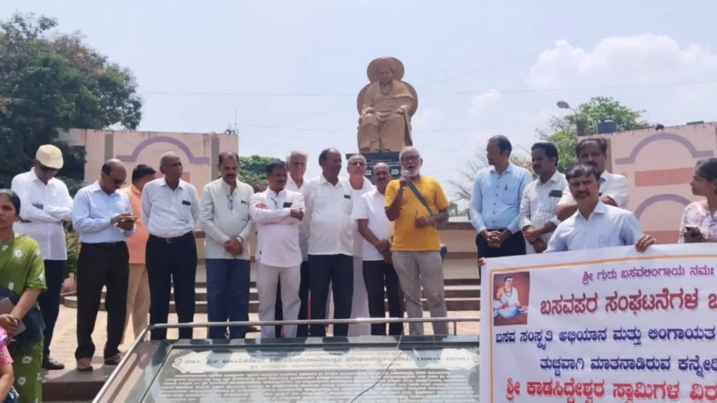 ಲಿಂಗಾಯತ ಮಠಾಧೀಶರು ಮತ್ತು ಬಸವ ಸಂಸ್ಕೃತಿ ಅಭಿಯಾನವನ್ನು ಅವಹೇಳನ ಮಾಡಿರುವ ಕನ್ನೇರಿ ಕಾಡಸಿದ್ದೇಶ್ವರ ಸ್ವಾಮಿಯನ್ನು ಗಡಿಪಾರು ಮಾಡುವಂತೆ ಆಗ್ರಹಿಸಿ ಬಸವಪರ ಸಂಘಟನೆಗಳ ಸದಸ್ಯರು ಇಂದು ನಗರದ ಜಯದೇವ ವೃತ್ತದ ಬಳಿ ಪ್ರತಿಭಟನೆ ನಡೆಸಿದವು.