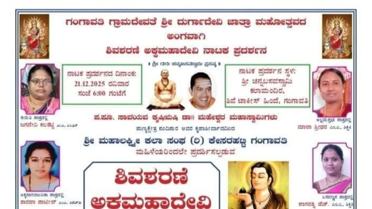 ಗಂಗಾವತಿ, ಕೇಸರಹಟ್ಟಿಯ ಶ್ರೀ ಮಹಾಲಕ್ಷ್ಮಿ ಕಲಾ ಸಂಘದ ಮಹಿಳೆಯರಿಂದಲೇ ಪ್ರದರ್ಶಿಸಲ್ಪಡುವ ಈ ನಾಟಕ ಡಿಸೆಂಬರ್ 21ರ ರವಿವಾರ ಸಂಜೆ 6 ಗಂಟೆಗೆ ಚನ್ನಬಸವಸ್ವಾಮಿ ಕಲಾಮಂದಿರದಲ್ಲಿ ನಡೆಯಲಿದೆ.