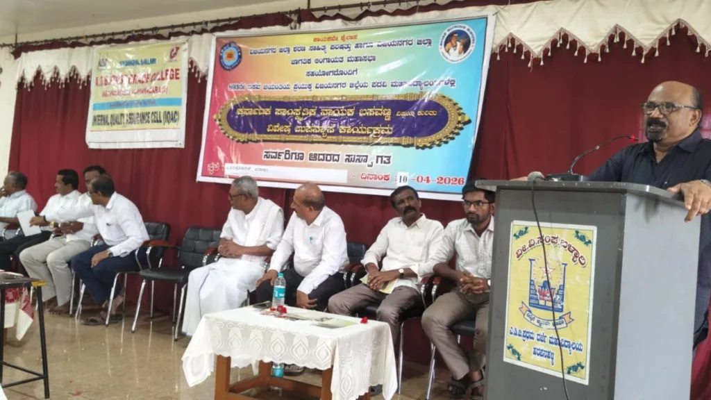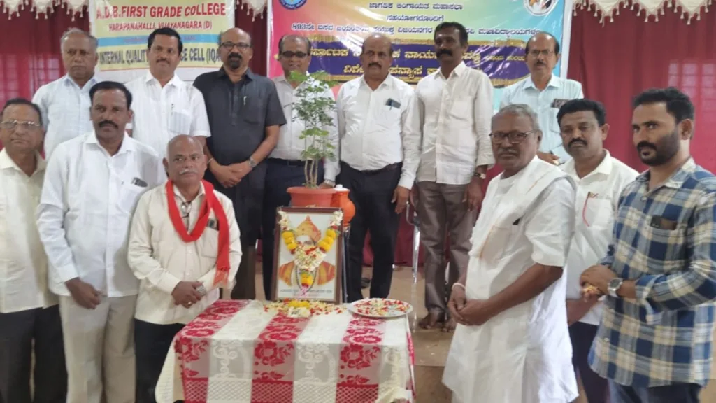 ಪಟ್ಟಣದ ಅಂಬ್ಲಿ ದೊಡ್ಡಭರಮಪ್ಪ ಪ್ರಥಮದರ್ಜೆ ಕಾಲೇಜಿನಲ್ಲಿ ಶುಕ್ರವಾರ ವಿಜಯನಗರ ಜಿಲ್ಲಾ ಶರಣ ಸಾಹಿತ್ಯ ಪರಿಷತ್ತು, ಜಾಗತಿಕ ಲಿಂಗಾಯತ ಮಹಾಸಭಾ, ಕಾಲೇಜು ಐ.ಕ್ಯೂ.ಎ.ಸಿ. ಸಹಬಾಗಿತ್ವದೊಂದಿಗೆ 893ನೇ ಬಸವ ಜಯಂತಿ ಪ್ರಯುಕ್ತ ‘ಕರ್ನಾಟಕ ಸಾಂಸ್ಕೃತಿಕ ನಾಯಕ ಬಸವಣ್ಣ ವಿಶೇಷ ಉಪನ್ಯಾಸ’ ಕಾರ್ಯಕ್ರಮವನ್ನು ಉದ್ಘಾಟಿಸಿ, ಬಸವಣ್ಣನವರ ಭಾವಚಿತ್ರಕ್ಕೆ ಪುಷ್ಪನಮನ ಸಲ್ಲಿಸಿ ಮಾತನಾಡಿದರು.