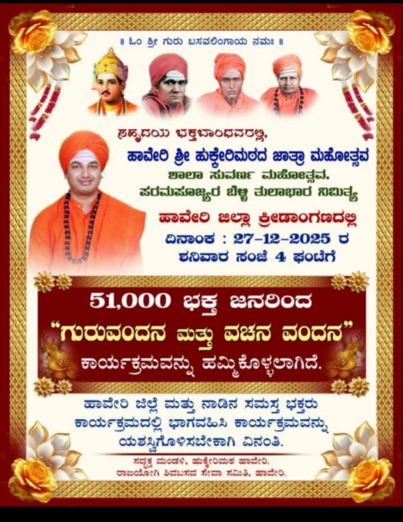 ಇಲ್ಲಿಯ ಹುಕ್ಕೇರಿ ಮಠದ ಸದಾಶಿವ ಸ್ವಾಮೀಜಿಯವರ 15ನೇ ವರ್ಷದ ಪಟ್ಟಾಧಿಕಾರವನ್ನು ಆಚರಿಸಲು ಡಿಸೆಂಬರ್ 27ರಂದು ವಚನ ವಂದನ ಕಾರ್ಯಕ್ರಮ ಆಯೋಜಿಸಲಾಗಿದೆ.