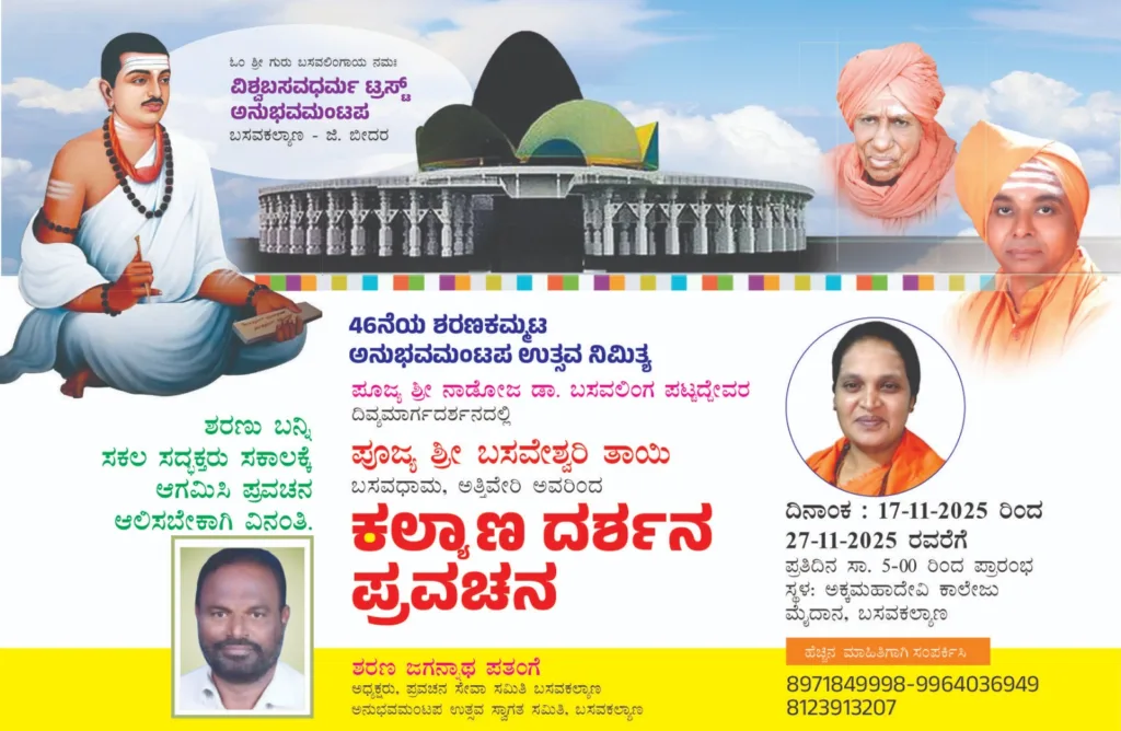 ಬಸವಕಲ್ಯಾಣದಲ್ಲಿ ನಡೆಯುವ ೪೬ನೆಯ ಶರಣ ಕಮ್ಮಟ ಹಾಗೂ ಅನುಭವಮಂಟಪ ಉತ್ಸವ-೨೦೨೫ ನಿಮಿತ್ಯ ಅತ್ತಿವೇರಿ ಬಸವಧಾಮದ ಪೂಜ್ಯ ಬಸವೇಶ್ವರಿ ಮಾತಾಜಿ ಅವರಿಂದ ಹಮ್ಮಿಕೊಂಡಿರುವ ಕಲ್ಯಾಣ ದರ್ಶನ ಪ್ರವಚನದ ಮಂಗಲ ನವೆಂಬರ್ ೨೭, ೨೦೨೫ ರಂದು ಸಾಯಂಕಾಲ ೫-೩೦ ಗಂಟೆಗೆ ನಡೆಯಲಿದೆ.