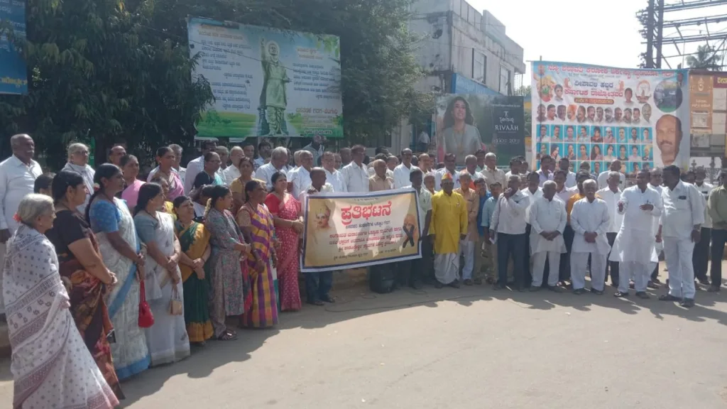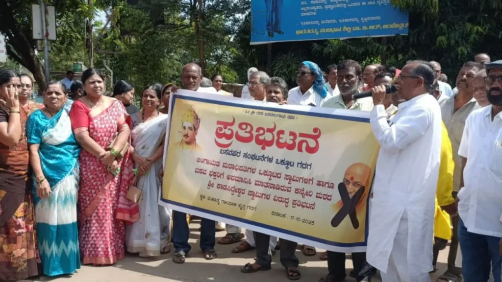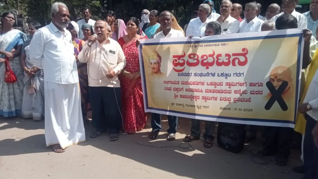 ಕನ್ನೇರಿ ಕಾಡಸಿದ್ದೇಶ್ವರ ಸ್ವಾಮಿಯ ಜಿಲ್ಲೆ ಮತ್ತು ರಾಜ್ಯ ಪ್ರವೇಶ ನಿರ್ಬಂಧಿಸಲು ಆಗ್ರಹಿಸಿ ಜಿಲ್ಲೆಯ ಬಸವಪರ ಸಂಘಟನೆಗಳ ಸದಸ್ಯರು ಶುಕ್ರವಾರ ನಗರದ ಗಾಂಧಿ ವೃತ್ತದಲ್ಲಿ ಬೃಹತ್ ಪ್ರತಿಭಟನೆ ನಡೆಸಿದರು.