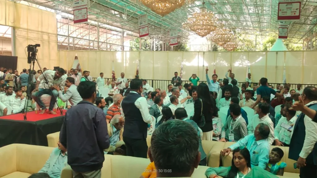 - * ಬೌನ್ಸರ್ ಗಳ ಸಹಾಯದಿಂದ ಒಬ್ಬೊಬ್ಬ ಕಾರ್ಯಕರ್ತರನ್ನು ಹರಸಾಹಸದಿಂದ ಹೊರ ಹಾಕಿದರೂ, ಘೋಷಣೆ, ಘರ್ಷಣೆ ಸಭಾಂಗಣದ ಮುಂದಿದ್ದ ಕಾರಿಡಾರ್ ನಲ್ಲಿ ಮುಂದುವರೆಯಿತು.