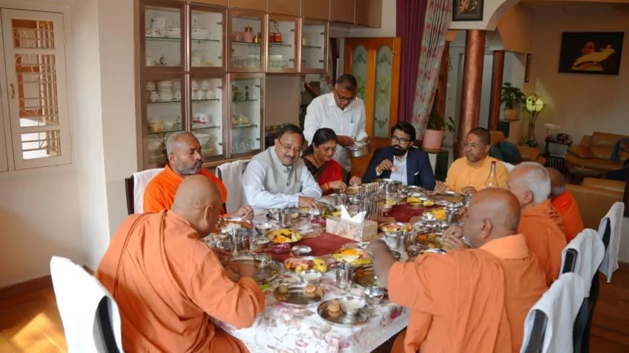 ಆರು ಖಾವಿಧಾರಿಗಳ ಜೊತೆಗೆ ಏಕಾಗ್ರತೆಯಿಂದ ಉಣ್ಣುತ್ತಿರುವ ಕನ್ನೇರಿ ಸ್ವಾಮಿಯ ಮುಂದಿರುವ ಟೇಬಲ್ ಖಾಲಿ ಜಾಗ ಇರದಷ್ಟೂ ಭಕ್ಷ್ಯಗಳಿಂದ ತುಂಬಿದೆ. ಜೊತೆಗೆ ಜೊಲ್ಲೆ ದಂಪತಿಗಳೂ ಫೋಟೋದಲ್ಲಿ ಕಾಣುತ್ತಾರೆ.