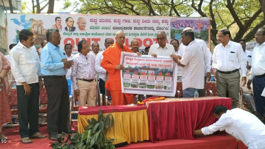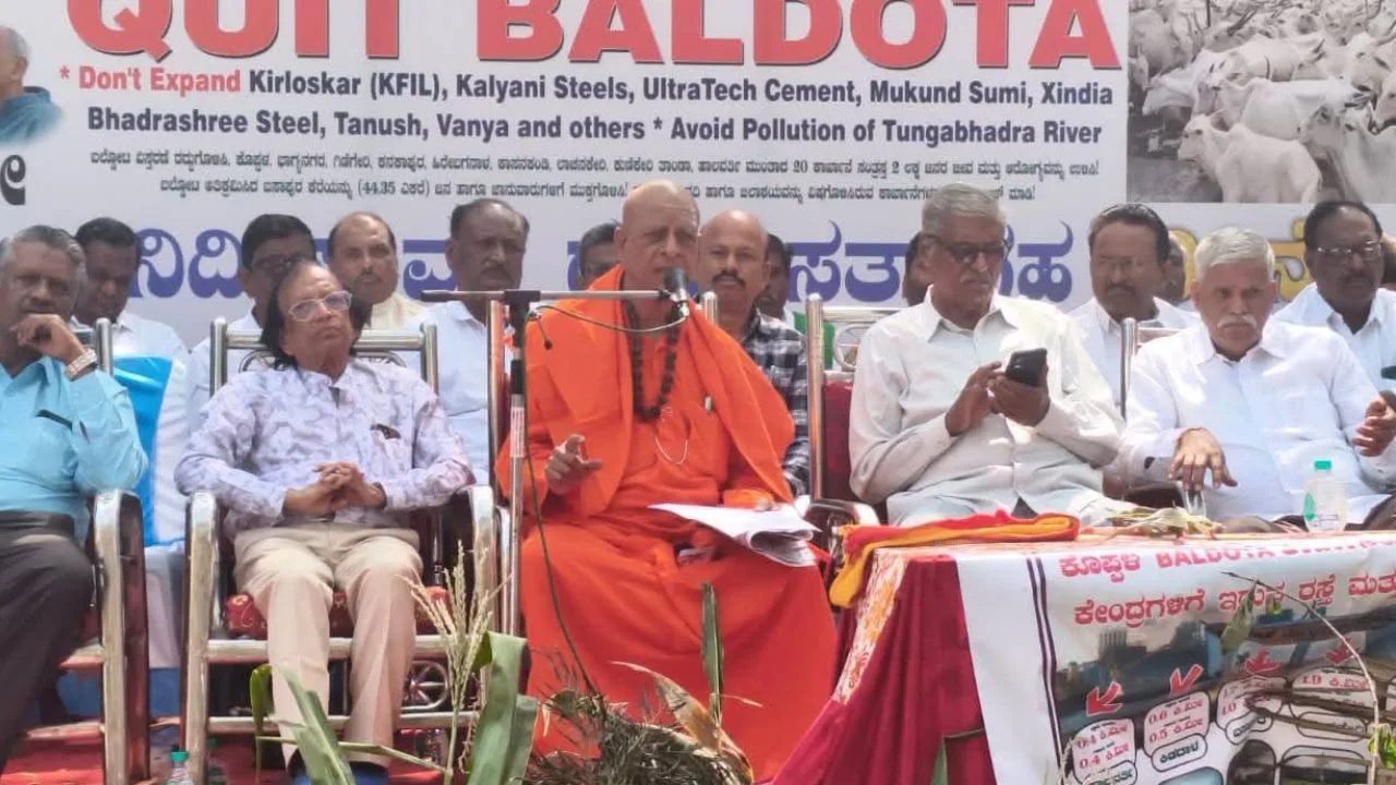 ಕೊಪ್ಪಳದಲ್ಲಿ ಕಾರ್ಖಾನೆ ವಿಸ್ತರಣೆ ವಿರೋಧಿಸಿ ನಡೆದ ನೂರನೇ ದಿನದ ಅನಿರ್ದಿಷ್ಟಾವಧಿ ಹೋರಾಟದಲ್ಲಿ ಭಾಗವಹಿಸಿ ಸಾಣೇಹಳ್ಳಿಯ ಶ್ರೀ ಪಂಡಿತಾರಾಧ್ಯ ಶಿವಾಚಾರ್ಯ ಮಹಾಸ್ವಾಮಿ ಬೆಂಬಲ ಸೂಚಿಸಿದರು.