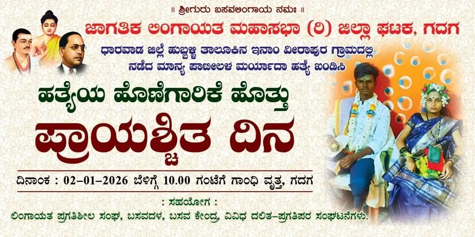 ಜಾಗತಿಕ ಲಿಂಗಾಯತ ಮಹಾಸಭಾ ಮತ್ತು ಇತರ ಬಸವಪರ ಸಂಘಟನೆಗಳಿಂದ ಹುಬ್ಬಳ್ಳಿ ತಾಲ್ಲೂಕು ಇನಾಂವೀರಾಪೂರ ಗ್ರಾಮದಲ್ಲಿ ನಡೆದ ಮಾನ್ಯ ಪಾಟೀಲ ಅವರ ಮರ್ಯಾದೆಗೇಡು ಹತ್ಯೆ ಖಂಡಿಸಿ, ಪ್ರಾಯಶ್ಚಿತ್ತ ದಿನ ಕಾರ್ಯಕ್ರಮ ಮಹಾತ್ಮಗಾಂಧಿ ವೃತ್ತದಲ್ಲಿ ಶುಕ್ರವಾರ ಬೆಳಿಗ್ಗೆ ೧೦ ಗಂಟೆಯಿಂದ ಮಧ್ಯಾಹ್ನ ೨ ಗಂಟೆವರೆಗೆ ನಡೆಯಲಿದೆ.