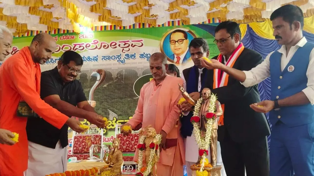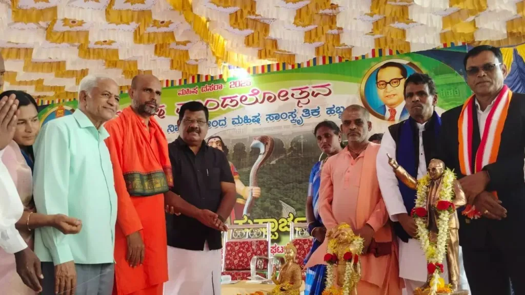 ಮಹಿಷ ದಸರಾ ಆಚರಣಾ ಸಮಿತಿ ವತಿಯಿಂದ ವಿಜೃಂಭಣೆಯಿಂದ ಮಹಿಷ ದಸರಾ ಆಚರಣೆ ಮಾಡಲಾಯಿತು. ನಗರದ ಪುರಭವನದ ಆವರಣದಲ್ಲಿ ಹಾಕಲಾಗಿದ್ದ ವೇದಿಕೆಯಲ್ಲಿ ಬುಧವಾರ ಕಂಚಿನ ಮಹಿಷ, ಬುದ್ಧ, ಅಂಬೇಡ್ಕರ್ ಪ್ರತಿಮೆಗೆ ಪುಷ್ಪಾರ್ಚನೆ ಮಾಡಲಾಯಿತು.