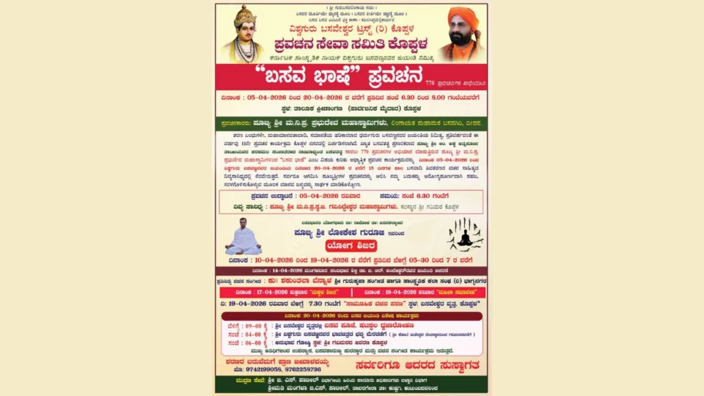 ವಿಶ್ವಗುರು ಬಸವೇಶ್ವರ ಟ್ರಸ್ಟ್ ಮತ್ತು ಪ್ರವಚನ ಸೇವಾ ಸಮಿತಿ, ಕೊಪ್ಪಳ ಇವರಿಂದ ವಿಶ್ವಗುರು ಬಸವಣ್ಣನವರ ಜಯಂತಿ ಅಂಗವಾಗಿ 2026, ಎಪ್ರೀಲ್ 5 ರಿಂದ 20 ರವರೆಗೆ ಪ್ರತಿದಿನ ಸಂಜೆ 6:30 ರಿಂದ 8 ಗಂಟೆವರೆಗೆ ನಗರದ ತಾಲೂಕ ಕ್ರೀಡಾಂಗಣದಲ್ಲಿ ”ಬಸವ ಭಾಷೆ” ಪ್ರವಚನ ನಡೆಯಲಿದೆ.