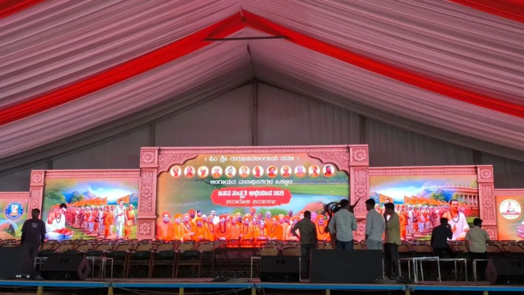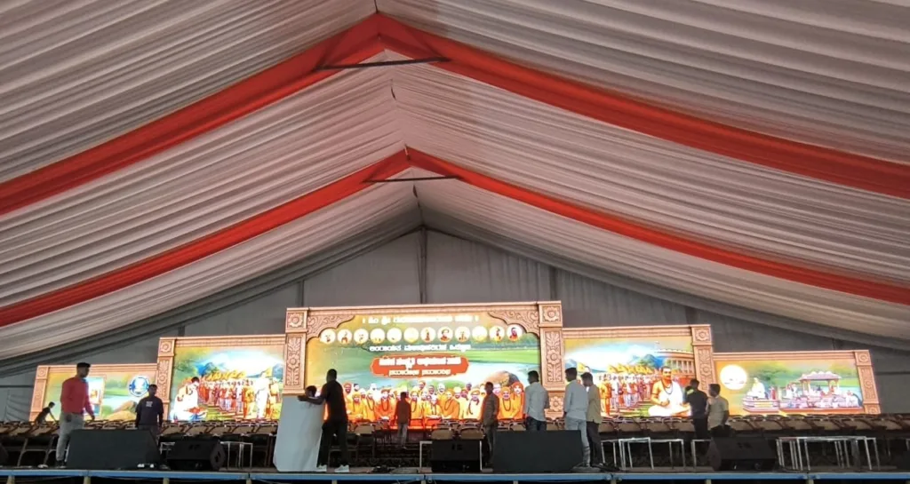 ಬೆಂಗಳೂರಿನಲ್ಲಿ ಭಾನುವಾರ ನಡೆಯುವ ಬಸವ ಸಂಸ್ಕೃತಿ ಅಭಿಯಾನ ಸಮಾರೋಪ ಸಮಾರಂಭದ ವೇದಿಕೆ ಸಿದ್ಧತೆ ಪೂರ್ಣಗೊಂಡಿದೆ.