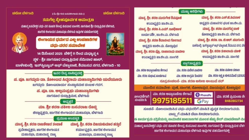ಡಿಸೆಂಬರ್ 14 ರಂದು ರವಿವಾರ ಬೆಳಗಾವಿಯ ನಾಗನೂರು ರುದ್ರಾಕ್ಷಿಮಠದ ಎಸ್.ಜಿ. ಬಾಳೆಕುಂದ್ರಿ ಇಂಜಿನಿಯರಿಂಗ್ ಕಾಲೇಜು ಸಭಾಗೃಹದಲ್ಲಿ ರಾಜ್ಯಮಟ್ಟದ ವಧು-ವರರ ಮತ್ತು ಪಾಲಕರ ಸಮ್ಮೇಳನ ನಡೆಯಲಿದೆ.