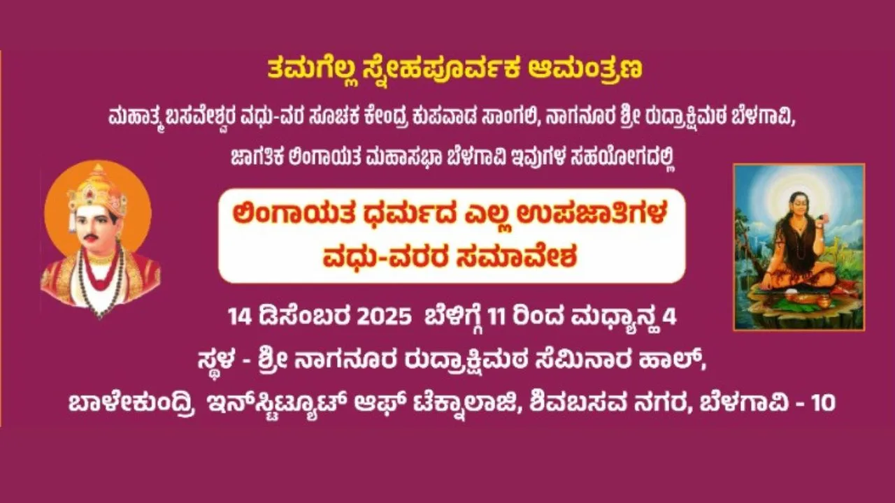 ಡಿಸೆಂಬರ್ 14 ರಂದು ರವಿವಾರ ಬೆಳಗಾವಿಯ ನಾಗನೂರು ರುದ್ರಾಕ್ಷಿಮಠದ ಎಸ್.ಜಿ. ಬಾಳೆಕುಂದ್ರಿ ಇಂಜಿನಿಯರಿಂಗ್ ಕಾಲೇಜು ಸಭಾಗೃಹದಲ್ಲಿ ರಾಜ್ಯಮಟ್ಟದ ವಧು-ವರರ ಮತ್ತು ಪಾಲಕರ ಸಮ್ಮೇಳನ ನಡೆಯಲಿದೆ.